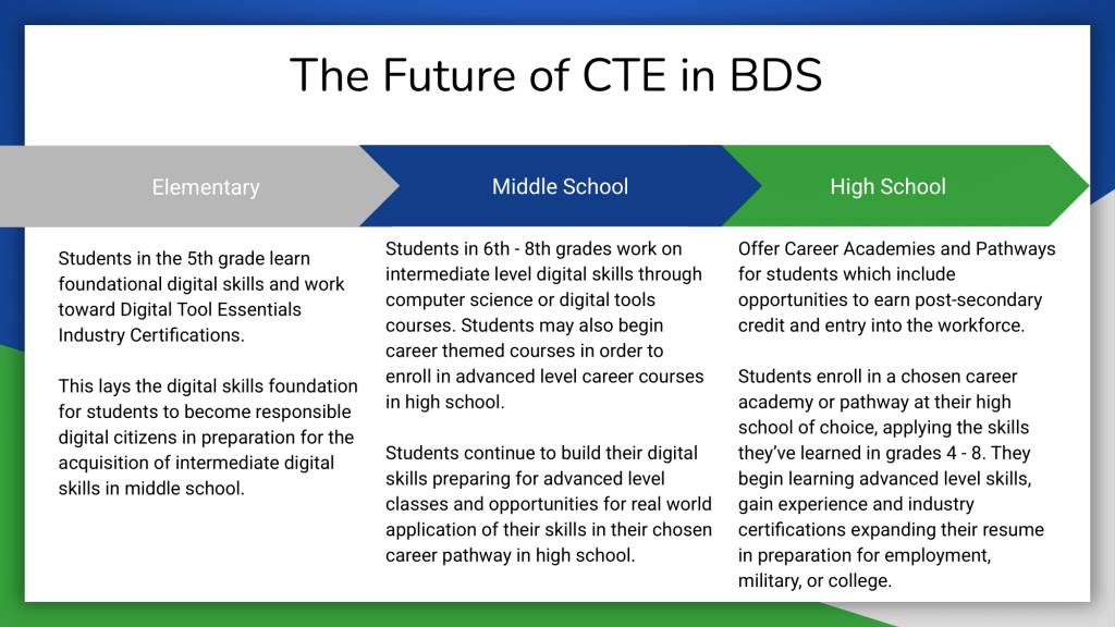 Currently, CTE courses are offered in grades 4 - 12. Students in grades 4 - 8 complete foundational technology courses to prepare for their high school career pathway of choice. Once students reach the 9th grade, they choose a career pathway and begin coursework within this pathway for the completion of their career sequence by graduation. The following graphic illustrates the general structure of CTE in Bay District Schools:
